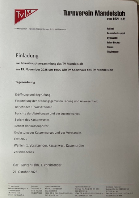 Einladung zur Jahreshauptversammlung am 19. November 2025 um 19:00 Uhr im Sporthaus