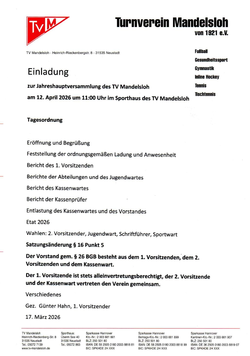 Einladung zur Hauptversammlung am 12. April 2026 um 11:00 Uhr im Sporthaus des TV Mandelsloh
